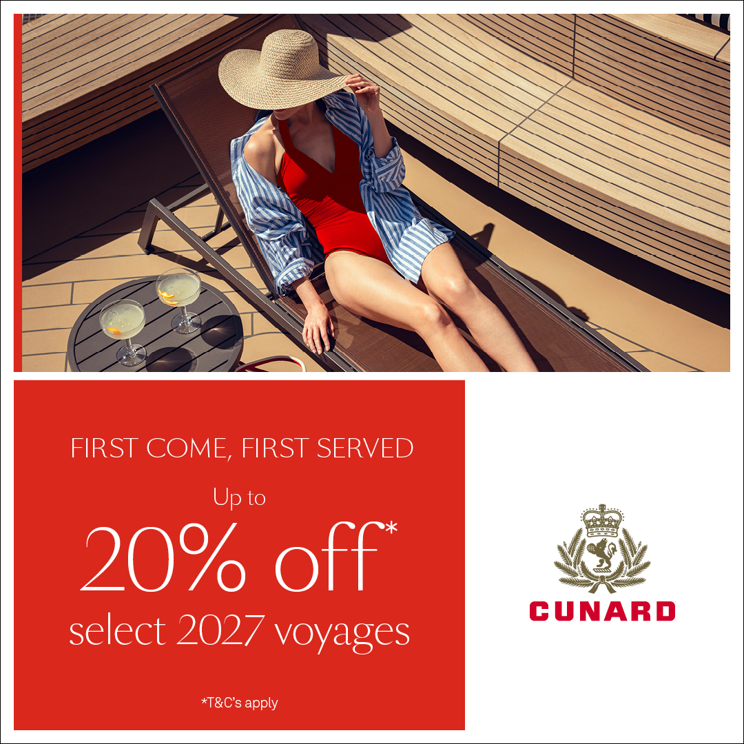 “First Come, First Served” Offer starts 31 March 2026 at 00.00am AEDT and ends 29 June 2026 11.59pm AEST. Advertised fares are available until allocation is exhausted and may fluctuate. Comparison based on Cunard Fare available from 16 December 2025. Savings are available on selected itineraries and vary by stateroom category, fare type and itinerary. ​